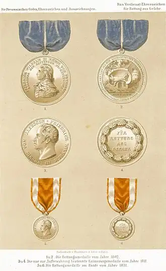 The Lifesaving Medal (German: Rettungsmedaille am Band) was a civil decoration of the Kingdom of Prussia. Established 1 February 1833, it was awarded to individuals who had saved another person's life, at risk to their own. This medal is referred to as the Lifesaving Medal on Band to differentiate it from a previous non-portable award established in 1802.[2] Otto von Bismarck received it for rescuing a drowning man.[3]