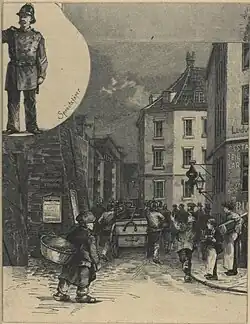 By 1850, the ground-floor apartment to the left was occupied by the businessman (grosserer) Heymann Israel Drucker (1819–1887), his one-year-old daughter Pauline Rosalie Drucken, his employee Michael Bendix Jacobsen, a wet nurse and a maid.[12] Duncker's wife Sofie Henriques (1812–1896), a daughter of Ruben Henriques, is not mentioned in the census records. Johan Fredrick Reuch, a musician in the Royal Danish Orchestra, resided in the other ground floor apartment with his wife Ida Elisabeth Rauch née Omoth and a maid.[13][14] Hans Jensen Trelde, a barkeeperand courier working for Klasselotteriet, resided in the basement with his wife Konen Kirstine Trelde, their four children and two maids.[15][16]