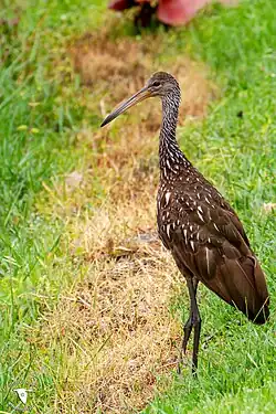 The limpkin (Aramus guarauna), also called carrao, courlan, and crying bird, is a large wading bird related to rails and cranes, and the only extant species in the family Aramidae. It is found mostly in wetlands in warm parts of the Americas, from Florida to northern Argentina, but has been spotted as far north as Wisconsin[3] and Southern Ontario.[4] It feeds on molluscs, with the diet dominated by apple snails of the genus Pomacea. Its name derives from its seeming limp when it walks.[5]