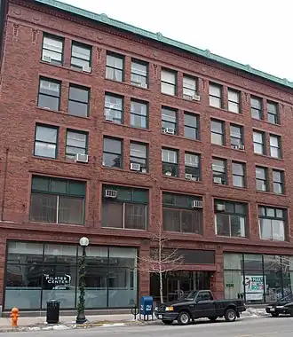 Built in 1916, the five-story, Commercial style building was designed by architect Harry Roberts Temple. The five-story brick building features a copper cornice and terra cotta decorations. The building's facade is divided into a first-floor base, shaft, and capital at the top, a feature of Commercial style buildings modeled after Classical columns. The first two floors of the building feature large sash windows, with storefront windows on the first floor and display windows on the second; the upper stories have smaller double-hung sash windows. The building's interior features terrazzo floors, marble accents, and wood trim.[2]