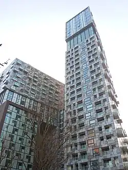Lincoln Plaza is a 31-storey luxury housing development situated on Millharbour on the Isle of Dogs, part of the Docklands area of London, England and located near South Quay DLR station. Lincoln Plaza is one of several new high-rise residential developments that have been constructed on the Isle of Dogs in recent years. Designed by BUJ Architects for Galliard Homes,[1] it features two residential towers, and also includes a hotel.[2] The hotel opened in 2018[3][4] and will operate under the Curio brand by Hilton.[5]