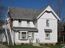 • The Warner house at 126 W. Lincoln is a 2-story simple Queen Anne-styled house built about 1871(?), tall and narrow, with a porch supported by turned posts, with a decorative crown over each window, and with a corbelled chimney.[4][5] The house was built by Jacob Warner, an immigrant from Wurtemburg, Germany.[2]