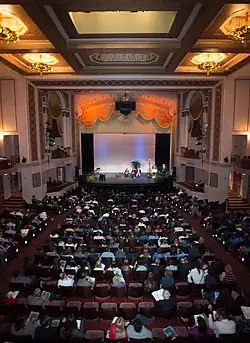 The 1,250-seat[19] theater has hosted theatrical and musical shows including a 2002 multi-week run of The Jackie Wilson Story from Chicago's Black Ensemble Theatre, and leased space to community groups and for events,[20] and hosted political events such as the mayor's State of the District address.[21] Jazz performances in recent years have included Cassandra Wilson, Quincy Jones, Chuck Brown, and Wynton Marsalis.[22] In 2005, the annual Duke Ellington Jazz Festival was inaugurated and hosted performances.[23] Others that have performed at the Lincoln Theatre include Damien Rice,[24] singer Brian Stokes Mitchell,[25] and comedians Dave Chappelle and Dick Gregory.[26] Lincoln Theatre has also been a venue for Filmfest DC.[27] The theater was the primary venue for the annual LGBT film festival Reel Affirmations from 1998 to 2008. From 2008 to 2010, Arena Stage mounted several productions at the theater, including Carrie Fisher's Wishful Drinking, while its Southwest Waterfront complex was being renovated.[28]