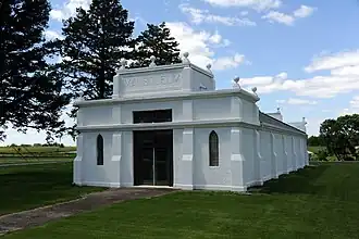 The Lincoln Township Mausoleum, also known as the Zearing Mausoleum, is a historic building located in Zearing, Iowa, United States. It is situated along the western edge of Zearing Cemetery, near a windbreak of trees. The mausoleum is a single-story concrete structure, rectangular in shape, that was completed in 1912. Most of the building is capped with a gable roof, but the front has a series of three flat roofs. The exterior walls are covered with stucco, painted white. It combines elements of the Mission, Late Gothic Revival, and Neoclassical styles. The interior features a central hall with 100 crypts on both sides. They are stacked in four horizontal rows, and are faced with marble panels. The building is significant for its "monolithic concrete construction used to build a public mausoleum," which is a rarity in Iowa.[2] The mausoleum was listed on the National Register of Historic Places in 2007.[1]