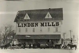 Two mills were first built in Linden in 1837 and 1838. These burned, and in 1850, Seth C. Sadler and M. Warren bought the mill sites and constructed the present gristmill as well as a saw mill located across the river. These mills were operated together, and known as the "Linden Mills." By 1864, Linden had 450 inhabitants, and multiple businesses that depended on the mills, such as furniture manufacturers, makers of, staves and carriages, and a grain elevator. The saw mill burned down during the Civil War, but was soon rebuilt. In 1864, Israel B. Hyatt purchased the mills, and in about 1880 Myron Harris took over.[3]