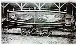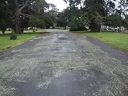 After a lengthy debate, Linwood Cemetery was connected to the Christchurch tramway system. Approval for construction of the line was given in April 1885.[8] Construction began on 26 November 1885 at Latimer Square and was completed by March 1886. The line was officially opened on 23 April 1886. Initially, it was the 'end of the line' from the city centre and people had to walk across or around the cemetery to connect with the tram line to New Brighton, which was run by a different company. By January 1887, the two lines had been connected.[9] The city council had a tram hearse built for up to four coffins, with the intention of providing cheaper form of transport to the cemetery than what funeral directors would charge. The scheme was a failure and it is believed that the tram hearse was never used. In 1888, a council committee recommended that the rails into the cemetery be removed again and used elsewhere, but this was never acted on, and the rails, although sealed over, are still faintly visible. The tram hearse was bought by Samuel Paull Andrews for £3 and used as an explosives store in his St Andrew's Hill quarry.[10]