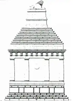 Pullan's sketch of his conjectural reconstruction of the funerary monument as first built. It is estimated to be 18 metres high and faced in marble. The lion weighs 6 tons.