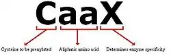 The prenylation motif “CaaX box” is the most common prenylation site in proteins, that is, the site where farnesyl or geranylgeranyl covalently attach.[2][3] In the CaaX box sequence, the C represents the cysteine that is prenylated, the A represents any aliphatic amino acid and the X determines the type of prenylation that will occur. If the X is an Ala, Met, Ser or Gln the protein will be farnesylated via the farnesyltransferase enzyme and if the X is a Leu then the protein will be geranylgeranylated via the geranylgeranyltransferase I enzyme.[3][4] Both of these enzymes are similar with each containing two subunits.[7]