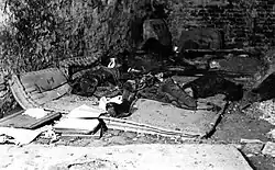 Meanwhile, around 2,500 severely wounded insurgents (unable to evacuate via the sewers) and some of their medical personnel remained in the Old Town.[3] Antoni Przygoński estimated that about 1,500 of the wounded soldiers were located in hospitals and medical points scattered throughout the district.[4] Most of them were placed in: the central insurgent hospital located in the Raczyński Palace at 7 Długa Street (about 450 wounded), the St. Hyacinth's Church (about 200 wounded), the hospital at 23 Miodowa Street (about 150 wounded), the hospital at 25 Podwale Street located in the basement of the "Krzywa Latarnia" restaurant (about 100 wounded), the hospital of Home Army battalions Wigry and Gustaw at 1/3 Kiliński Street (about 60 wounded), the building of the Warsaw Charity Society at 10 Freta Street (about 60 wounded), and the hospital at 46 Podwale Street located in the cellars of the "Czarny Łabędź" building (about 30 wounded).[5]