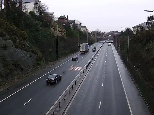 The site of the former Liscard & Poulton railway station, now the approach road from the M53 mid Wirral motorway into the Wallasey Tunnel.