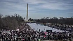District of Columbia Jan. 20 Washington, D.C. 10,000+[7] In Washington, D.C., thousands[8] gathered at the Reflecting Pool at the Lincoln Memorial and marched to the White House.[9] The crowd was smaller than the 2017 rally, which according to WUSA9 had almost 500,000 participants.[8] Just ahead of the start of the rally, over 12,000 people had RSVP'd they were attending on the event's Facebook page, with another 21,000 stating they were interested.[10] U.S. Sen Kirsten Gillibrand (D-NY), one of Trump's targets for Twitter attacks, addressed the crowd: "It is women who are holding our democracy together in these dangerous times." Also speaking, House Minority Leader Nancy Pelosi (D-CA), Sen. Tim Kaine (D-VA), Sen Richard Blumenthal (D-CT), DNC Chair Tom Perez, & Toni Van Pelt, president of the National Organization for Women.
