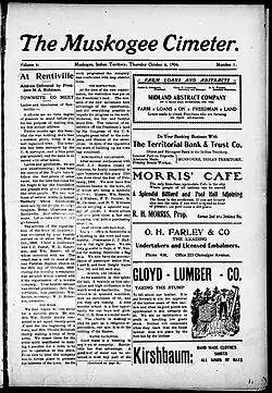39. ^ a b c d "About The Muskogee cimeter. [volume] (Muskogee, Indian Territory, Okla.) 1901-19??". Chronicling America. Library of Congress. Retrieved January 10, 2020.