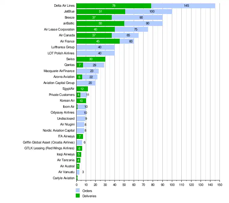 The A220 family has 941 firm orders from 34 customers, of which Delta is the largest with 145 orders. A total of 435 aircraft have been delivered as of July 2025.[67]