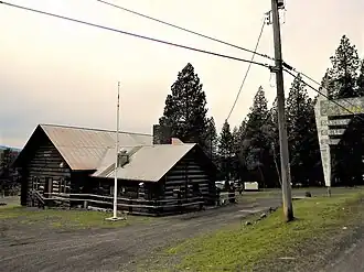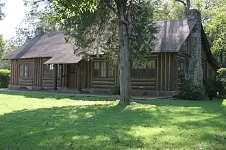 NRHP-listed[1] Single-story, T-shaped cypress log building with truss roof[2]