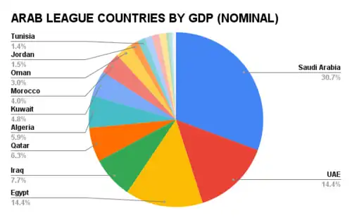 This article lists the countries of the Arab League sorted by their gross domestic product (GDP) at nominal values. GDP is the value of all final goods and services produced within a nation in a given year. The table below shows the nominal GDP and GDP per capita for the 22 member states of the Arab League in 2025. The figures shown are estimates compiled by the International Monetary Fund's World Economic Outlook.[1]