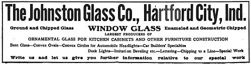 | 11 | Johnston Glass Company | Hartford City | 1900[31] | 1966[31] | 200 | Window glass company founded by former secretary and plant manager of Hartford City Glass Company, J. R. Johnston. Also made ornamental, bent, and chipped glass.[31] Employee count of 200 for 1903.[16] |