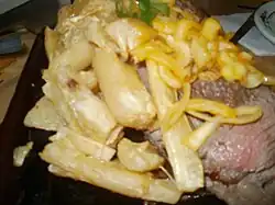 In Brazil, churrasco is the term for a barbecue (similar to the Argentine and Uruguayan asado). It uses a variety of meats, pork, sausage and chicken which may be cooked on a purpose-built "churrasqueira", a barbecue grill, often with supports for spits or skewers.[6] A churrascaria is a restaurant serving grilled meat, many offering as much as you can eat: the waiters move around the restaurant with the skewers, slicing meat onto the client's plate. |