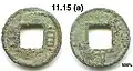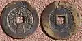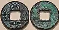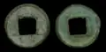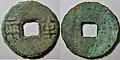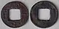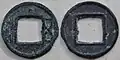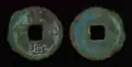 The rebel Gongsun Shu cast iron cash coins based on the Wu Zhu's of the Western Han dynasty in his rebel state of Chengjia in present-day Sichuan:[18]