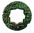 During the Warring states period, the first precursors of the Chinese cash coins started to appear. These early round coins (圜錢, huánqián) circulated alongside the knife and spade money. As most of these early round coins had round holes, the first "true" cash coins were the Yi Hua (一化) produced by the State of Yan.[4][5] Apart from two small and presumably late coins from the State of Qin, coins from the spade money area have a round hole and refer to the jin and liang units. Those from the knife money area have a square hole and are denominated in hua.[6]