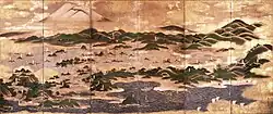the pair of six-panel folding-screens by Nagamasa Eishō (牧野永昌) (1747-1824) depict Kisakata (象潟) before the great 1804 earthquake that transformed the landscape; Matsuo Bashō visited in 1689 and celebrated Kisakata in Oku no Hosomichi; the area has been designated a Natural Monument[18][19] 39°12′06″N 139°54′26″E / 39.201556°N 139.907112°E / 39.201556; 139.907112 (Nikaho City Kisakata Historical Museum)