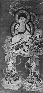 | Amida Raigō, colour on silk 絹本著色阿弥陀来迎図 kenpon chakushoku Amida raigō zō |