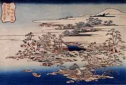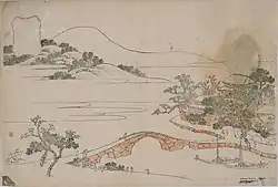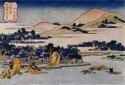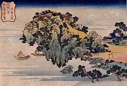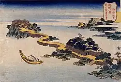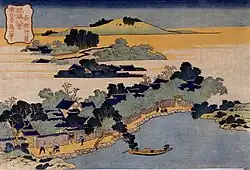 series of eight prints by Hokusai;[21] Evening Moon at Izumisaki (泉崎夜月), Sound of Lake Rinkai (臨海湖声), Bamboo Hedge at Kume Village (粂村竹籬), Pines and Waves at Ryūdō (龍洞松濤), Evening Glow at Jungai (筍崖夕照), Clear Autumn at Chōkō (長虹秋霽), Sacred Fountain at Castle Peak (城岳霊泉), and Banana Groves at Nakashima (中島蕉園) | ![]() ![]() ![]() ![]() ![]() ![]() ![]() ![]() |