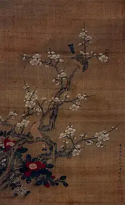 Chinese painter Sonoku, active in Fuzhou in the second half of the seventeenth century, exerted considerable influence on Ryūkyūan painting after local painters Ishimine Denbaku (石嶺伝莫) and Uehara Shinshira (上原真知ら) crossed to China and received instruction from him in 1683; Sonoku's painting of flowers and birds was presented in thanks to the Kikumura family after the shipwreck of the Imperial Chinese mission off Kumejima in 1756[7] | ![]() |