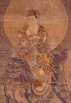| Kishi Monju, light colour on silk 絹本淡彩騎獅文殊像 kenpon tansai kishi Monju zō |