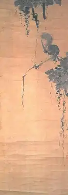 | Grapes and squirrel, ink on paper, by Miyamoto Musashi 紙本墨画葡萄栗鼠図 宮本武蔵筆 shihon bokuga budō risu zu Miyamoto Musashiō hitsu |
