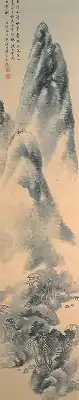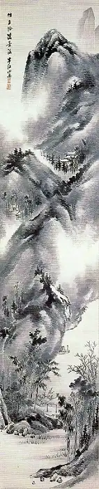 | Landscape, light colours on silk, by Yo Shakuya 絹本淡彩山水図 余夙夜筆 kenpon tansai sansui zu Yo Shakuya hitsu |