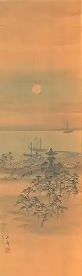 | Tsukuda-jima Sumiyoshi in Tōkyō Arashiyama in Kyōto Beach by the Light of the Rising Moon at Naniwa Sumiyoshi light colours on silk, by Andō Hiroshige 絹本淡彩 東都佃島住よし図 京都嵐山図 浪花住吉月出見の浜図 安藤広重筆 kenpon tansai Tō-to Tsukuda-jima Sumiyoshi zu Kyōto Arashiyama zu Naniwa Sumiyoshi tsuki de mi no hama zu (Andō Hiroshige hitsu) |