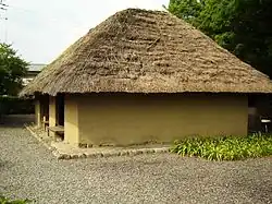 Bakumatsu to early Meiji period Ishii designation comprises eleven components: main building (1865), zashiki (1885), treasury (1859), front gate and storehouse (1870), indigo storehouse (1887), south (1860) and north (1873) indigo processing areas, and miso room, lodge, and ash store (early Meiji period) 34°05′25″N 134°26′47″E / 34.09019707°N 134.44649767°E / 34.09019707; 134.44649767 (Tanaka Family Residence) [14] [15] [16] [17] [18] [19] [20] [21] [22] [23] [24]