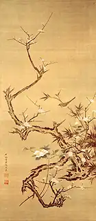 In Genryō (1718–1767) was born in Shuri and summoned to the Ryūkyū court on account of his talent in painting aged 12; from 1752 he spent two years in China; after the death of Yamaguchi Sōki (山口宗季), In Genryō was the leading court painter; most of his works are now lost; the shape of the branches of the plum and the distribution of its flowers, combining vigour with delicacy, are characteristic of the Southern School and thence of Nanga[8][9] | ![]() |