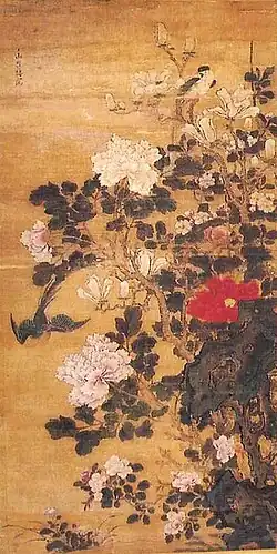 Chinese painter Sonoku, active in Fuzhou in the second half of the seventeenth century, exerted considerable influence on Ryūkyūan painting after local painters Ishimine Denbaku (石嶺伝莫) and Uehara Shinshira (上原真知ら) crossed to China and received instruction from him in 1683; Sonoku's painting of flowers and birds was presented in thanks to the Kikumura family after the shipwreck of the Imperial Chinese mission off Kumejima in 1756[7] | ![]() |