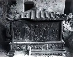 C15 | Urasoe | Urasoe City | four stone sarcophagi, of green tuff from Fujian; decoration on the four sides includes Buddhist figures and treasures, shisa, deer, birds, and flowers, while the lids imitate tiled roofs, with dragon and phoenix tile ends[6] | ![]() |