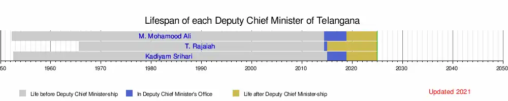 The first deputy chief minister of Telangana was Mahmood Ali,[2] who was also Minister of Revenue, Relief & Rehabilitation, ULC, Stamps & Registration in Chandrashekar Rao's first ministry. The second deputy chief minister was T. Rajaiah,[3] who took on the role in addition to his health ministership in K. Chandrashekar Rao's government. On 25 January 2015, the chief minister K. Chandrashekar Rao dismissed Rajaiah in the wake of serious charges of corruption in his department and soon that day position of Rajaiah was replaced by Kadiyam Srihari[4] and he became the third deputy chief minister of the state.