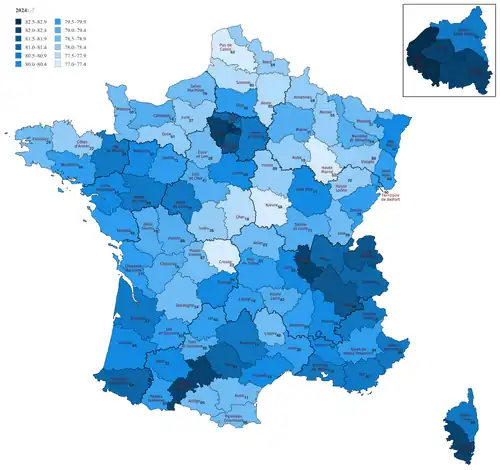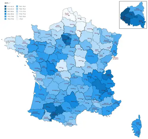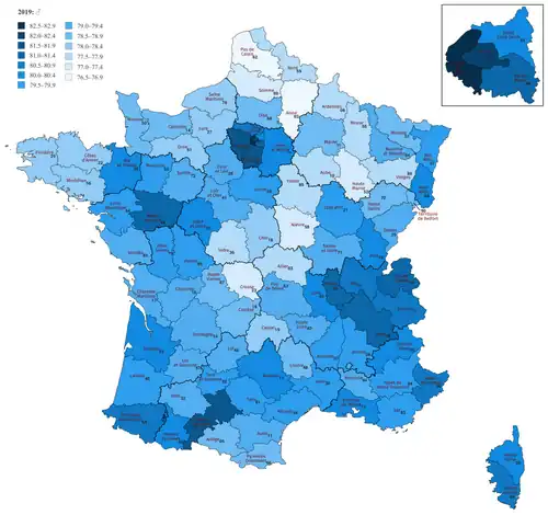 | 15 | Cantal | 78.8 | 84.2 | 5.4 | 81.50 | −0.15 | 78.4 | 84.3 | 5.9 | 81.35 | 0.75 | 79.5 | 84.7 | 5.2 | 82.10 | 0.60 |