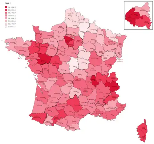 | 87 | Haute-Vienne | 78.5 | 84.7 | 6.2 | 81.60 | 0.65 | 78.8 | 85.7 | 6.9 | 82.25 | −0.20 | 78.8 | 85.3 | 6.5 | 82.05 | 0.45 |