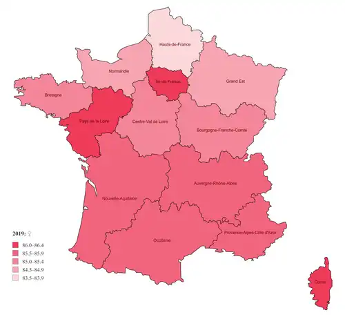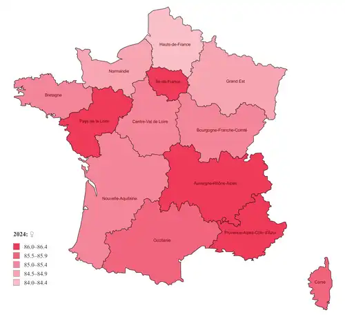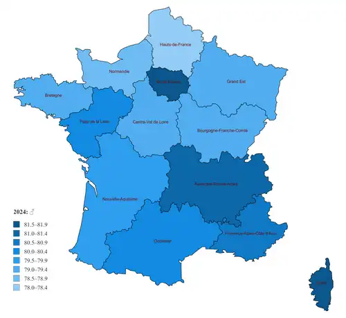 - ^ a b c d e f "Espérance de vie en 2024: Comparaisons régionales et départementales" [Life expectancy in 2024: comparison of regions and departments]. National Institute of Statistics and Economic Studies (France) (in French). Retrieved 2025-05-23.