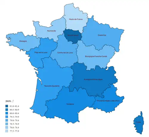 - ^ a b c d e f "Espérance de vie en 2019: Comparaisons régionales et départementales" [Life expectancy in 2019: comparison of regions and departments]. National Institute of Statistics and Economic Studies (France) (in French). Archived from the original on 2021-04-12. Retrieved 2024-03-29.
