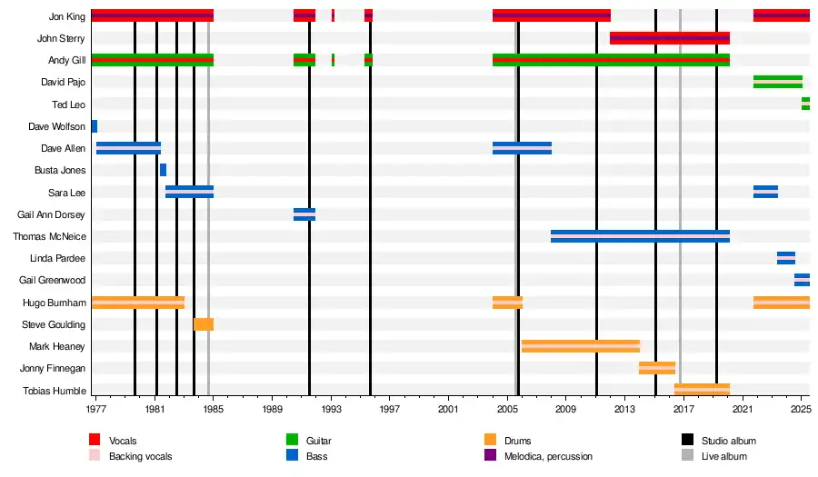 In 2004, the classic line-up of King, Gill, Burnham and Allen reunited for a UK tour in 2005.[7][8] Burnham departed again in late 2005 to continue to be a college professor, he was replaced by Mark Heaney.[9][10] Allen was also replaced by Thomas McNeice in 2008.[11] Founding member Jon King left in 2011 after disagreements with Gill, he was replaced by John Sterry.[12] Heaney was also replaced by Jonny Finnegan in 2014,[11] who was replaced by Tobias Humble in 2016.[13] Gill died in February 2020, ending this incarnation of the band.[14]
