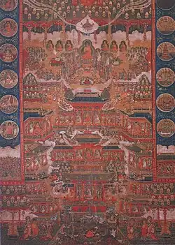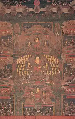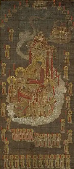 Visualization of the Hwaom Pure Land C13 five main buddhas are at the bottom, fifty-two bodhisattvas descend on clouds; ink, colour, and gold on silk; sold at Christie's in 2003 131.1 centimetres (4 ft 3.6 in) by 58.5 centimetres (1 ft 11.0 in) [69]