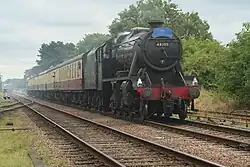| No. 45231 The Sherwood Forester | LMS Stanier Class 5 4-6-0 | 45231 spent most of its early career at Patricroft shed before being transferred to Northampton and then Aston in 1954. Its final depot was Carnforth, where it remained until the end of steam in 1968. It was initially preserved at Carnforth until moving to Loughborough in 1973 where it operated the official opening train between Loughborough and Quorn. it was a regular performer at Loughborough and was overhauled another couple of times. It left Loughborough in 2005 and in 2015 was purchased by Jeremy Hosking. The locomotive remains a regular performer on the main line.