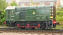 13101 (later D3101) was built at Derby Works as one of a batch of 10 air-braked shunters which were also given an English Electric 6KT engine and was allocated to the Southern Region. Based primarily at Ashford (73F) & Eastleigh (71A), in 1973 it left the Southern for use at Loughborough Midland station and its local sidings. After withdrawal it was bought by a Great Central Railway volunteer and arrived at Loughborough in December 1984. In 2010 it returned to regular shunting duties after a long restoration and now performs as shed pilot for Loughborough Central. Funds were raised on the 2012 Autumn Steam gala for this loco to be repainted and this long-awaited task was carried out and completed in time for the September 2013 Diesel gala, the livery being BR green. | BR green with wasp stripes and the early crest. | Private owner. | 1955 |