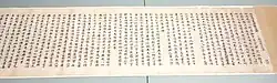 694 | one scroll with thirty-nine pages of hemp fibre paper, each with fifty-six ruled lines, each with thirty-two characters; brushwork by Li Yuanhui (李元恵); the scroll has a jasper-inlaid axis and a hollowed-out sandalwood case; said to have belonged to Shōtoku Taishi | 15.7 centimetres (6.2 in) by 2,150 centimetres (850 in) | N-7 | [11] [12] | |