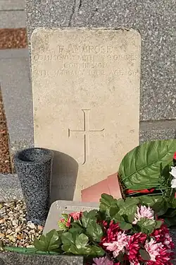 | Frederick William Ambrose | 7 January 1962 | Bray-sur-Somme Communal Cemetery | Aged 62. Served as Private Ambrose 016837 in the Royal Army Ordnance Corps. In November 1919 he married Juliette Bellanger in Abbeville. | ![]() |