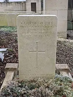 | George O. Hill | 22 July 1946 | Corbie Communal Cemetery Extension | Died age 47. Served with the Royal Welsh Fusiliers and South Wales Borderers during the Great War.[6] | ![]() |