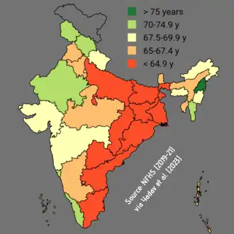 - ^ a b c Yadav, Pawan Kumar; Yadav, Suryakant (16 April 2024). "Subnational estimates of life expectancy at birth in India: evidence from NFHS and SRS data". BMC Public Health. 24 (1) 1058. doi:10.1186/s12889-024-18278-3. PMC 11021017. PMID 38627658. — Table 5 Estimated (Model-based) vs. calculated (ASDR-based) life expectancy at birth at national and state levels in India from NFHS-5 (2019-21) and SRS-2020.