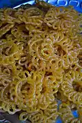 Jalebi Dough fried in a coil shape dipped in sugar syrup, often taken with milk, tea, yogurt, or lassi.[4] Fried, sugar syrup based