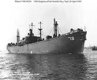Sabik was built by Todd Houston Shipbuilding Corporation, Houston, Texas. Her keel was laid as William Becknell on 8 November 1943. She was launched as Sabik on 17 December and delivered on 29 December.[2][3] Converted for naval use by Todd Johnson Drydocks, New Orleans, Louisiana. To the War Shipping Administration (WSA) in March 1946 and renamed William Becknell. Laid up in Suisun Bay. She was scrapped at Oakland, California in March 1961.[3]